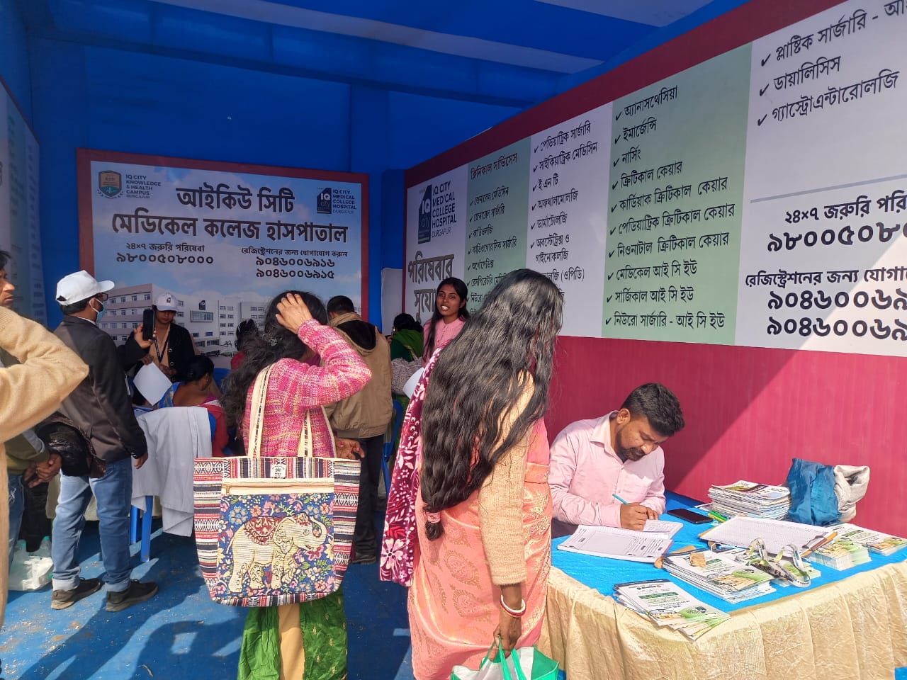 নিজস্ব প্রতিবেদক, দুর্গাপুর: দুর্গাপুরের আইকিউ সিটি মেডিকেল কলেজ ও হাসপাতালের উদ্যোগে চলমান জয়দেব মেলায় শুরু হয়েছে তিন দিনব্যাপী একটি স্বাস্থ্য পরীক্ষা শিবির। ১৪ জানুয়ারি থেকে শুরু হওয়া এই শিবির চলবে ১৬ জানুয়ারি, ২০২৬ পর্যন্ত। মেলায় আগত হাজার হাজার ভক্ত ও দর্শনার্থীর জন্য এই শিবিরে বিনামূল্যে প্রাথমিক চিকিৎসা পরিষেবা প্রদান করা হচ্ছে।