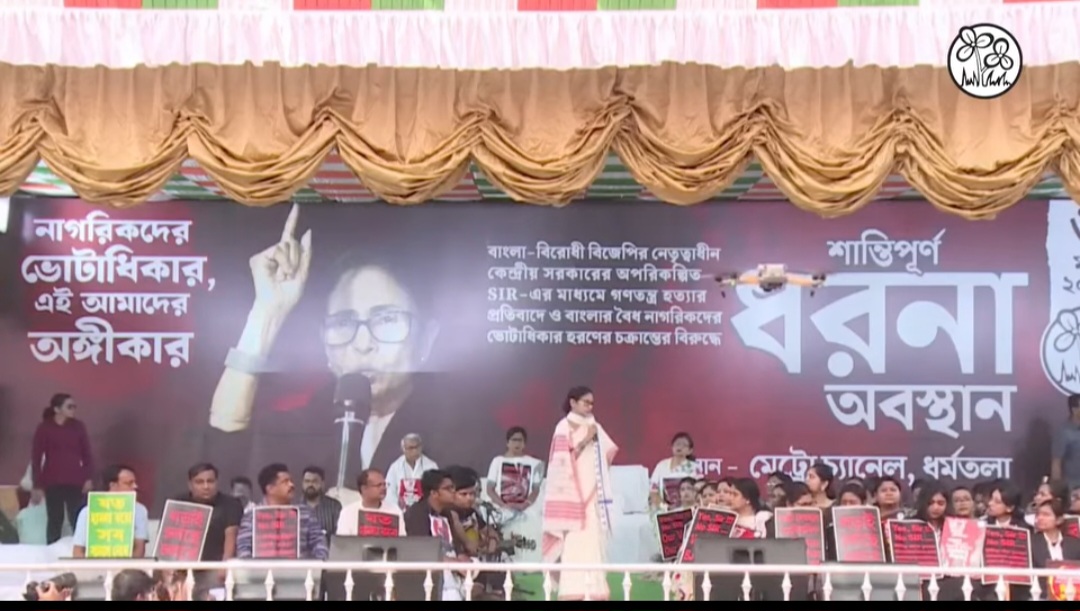নিজস্ব প্রতিবেদন: রাজ্যে অবাধ ও শান্তিপূর্ণ নির্বাচনের দাবিতে ধর্মতলার মেট্রো চ্যানেলে মমতা বন্দ্যোপাধ্যায়ের ধরনা আজ দ্বিতীয় দিনে পদার্পণ করল। গতকাল রাতভর ধরনা মঞ্চেই ছিলেন তৃণমূল নেত্রী। আজ সকালে ধরনা মঞ্চ থেকে কেন্দ্র ও নির্বাচন কমিশনকে তীব্র ভাষায় আক্রমণ শানান তিনি। বিজেপিকে হুঁশিয়ারি দিয়ে মুখ্যমন্ত্রী বলেন, “বেশি বাড়াবাড়ি করলে দিল্লির সরকার ফেলে দেব।”তৃণমূল নেত্রী স্পষ্ট জানিয়ে দিয়েছেন, নির্বাচন কমিশনের ফুল বেঞ্চ রাজ্যে না আসা পর্যন্ত এই আন্দোলন কর্মসূচি প্রত্যাহার করা হবে না। এসআইআর-এর (SIR) প্রতিবাদে শুরু হওয়া এই দীর্ঘস্থায়ী অবস্থানকে কেন্দ্র করে সরগরম তিলোত্তমার রাজনীতি। গতকাল থেকে শুরু হওয়া এই ধরনায় তৃণমূলের শীর্ষ নেতৃত্ব এবং কর্মী-সমর্থকদের ভিড় উপচে পড়ছে।